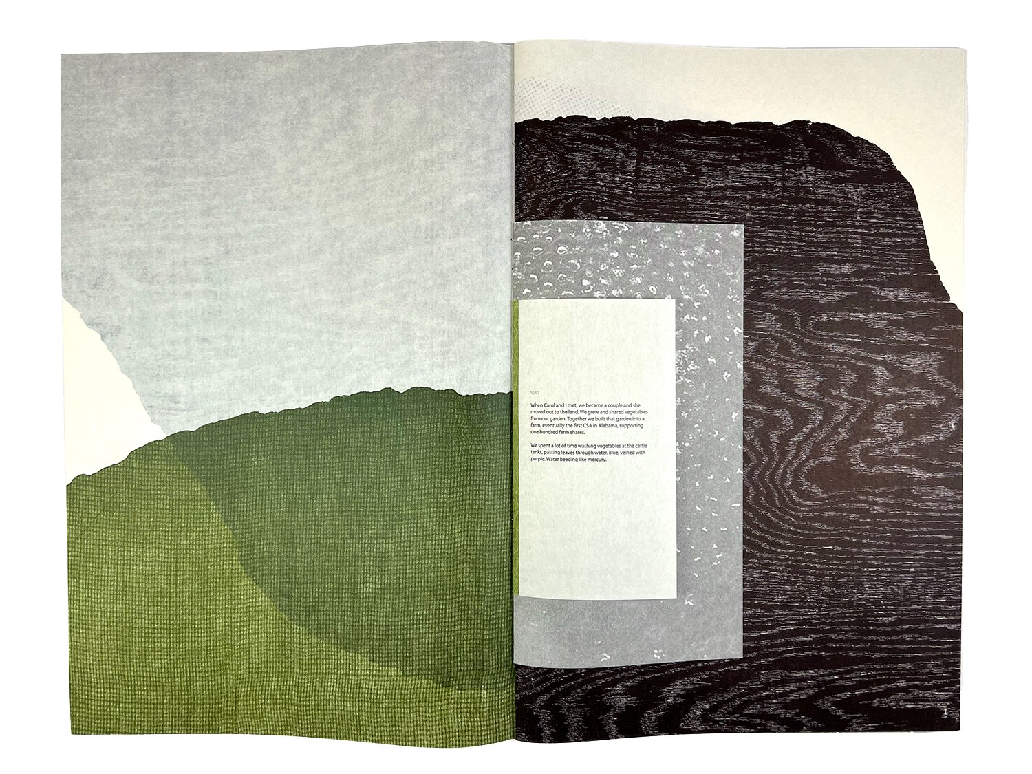 Small Patches of Land features the intertwining narratives of two women farmers, connected by a saved collard seed. Text for this project evolved from interviews with Margaret Ann Snow and Jean Mills. Imagery originated in photographs of collard plants at Snow’s Bend Farm and microscopic imaging of seeds harvested by Margaret Ann Snow in Spring of 2025. Printed on an etching press and a Vandercook proof press using masonite, polymer, birch plywood, and fabric.